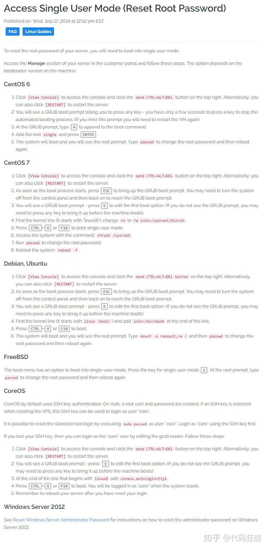 这里我翻译了一篇怎么进入CentOS7单用户模式的方法,至于其他系统,请看下面各系统进入单用户模式的方法,如果看不懂,请用你懂的姿势百度谷歌,这里我就不详细展开了