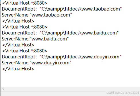 在XAMPP安装目录下,找到apache\\conf\\extra\\httpd-vhosts.conf文件(路径为C:\\xampp\\apache\\conf\\extra\\httpd-vhosts.conf)。