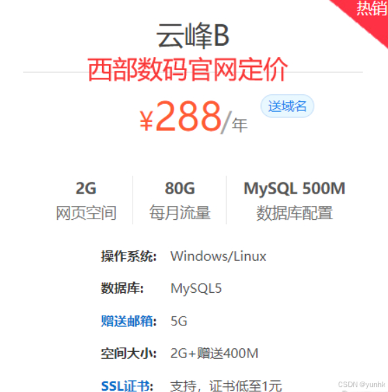 西部数码BGP多线虚拟主机云峰B型:西部数码官网定价288/年,代理商香港云空间202/年