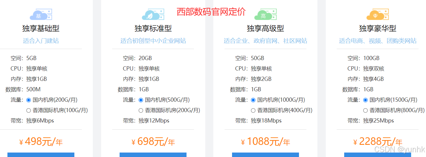 西部数码独享虚拟主机系列:西部数码官网定价,基础型498/年、标准型698/年、高级型1088/年、豪华型2288/年;代理商香港云空间定价,基础型349/年、标准型489/年、高级型762/年、豪华型1602/年