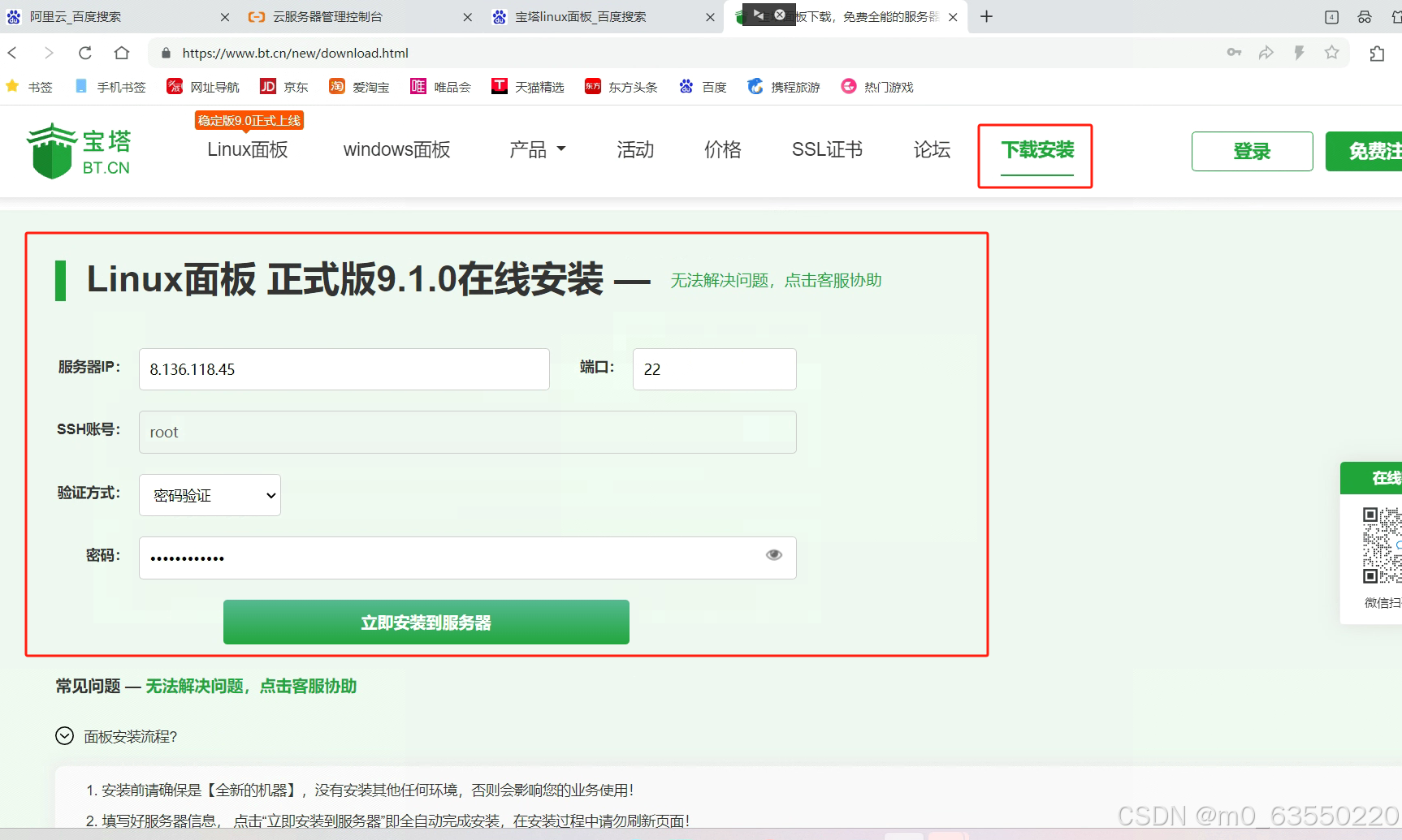 安装宝塔时选在线安装,输入ip密码就可以自动安装了