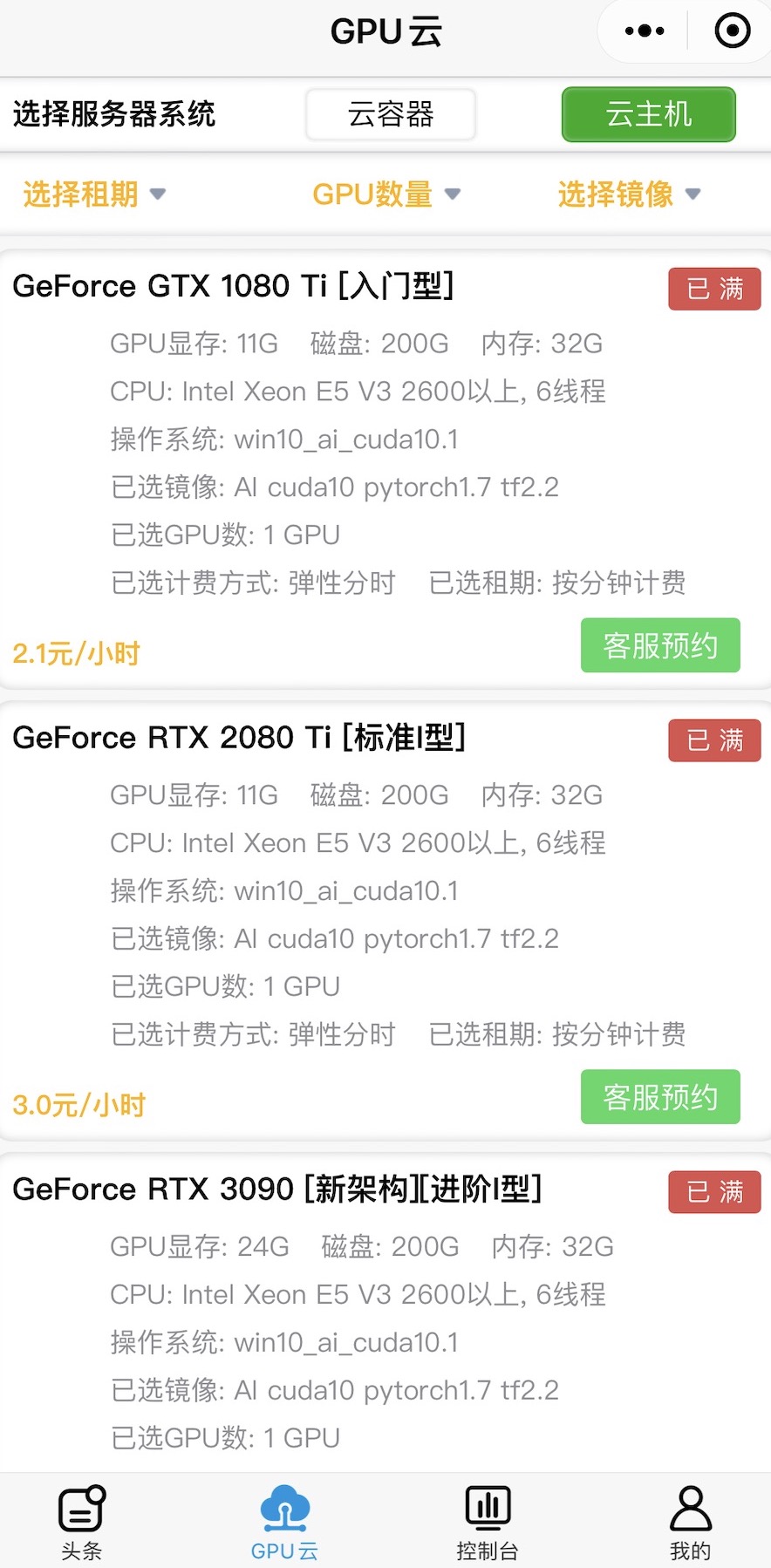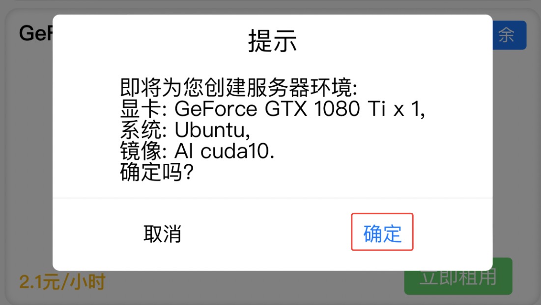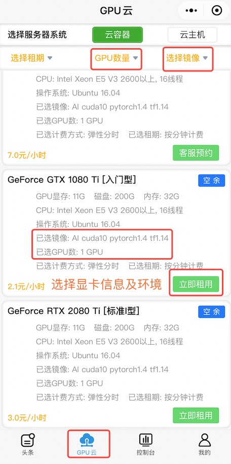 - 点最下面的GPU云,选择显卡设备信息价格及选择对应深度学习环境后,点击立即租用(一旦租用就开始积分,按分钟计时!)