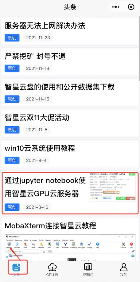 - 进入小程序后会自动跳转到头条,这里面有注意事项以及使用教程,主要可以使用【JupyterNotebook进行连接】,以及滑动头条列表最下面有教程【如何使用Pycharm远程连接智星云教程】