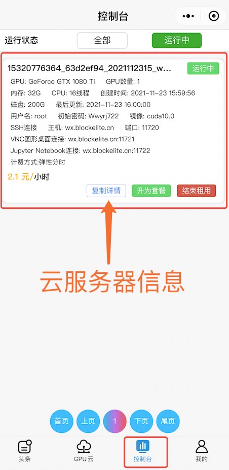 - 点击最下面的控制台,里面有云服务器的信息,点击复制详情,就可以复制信息。