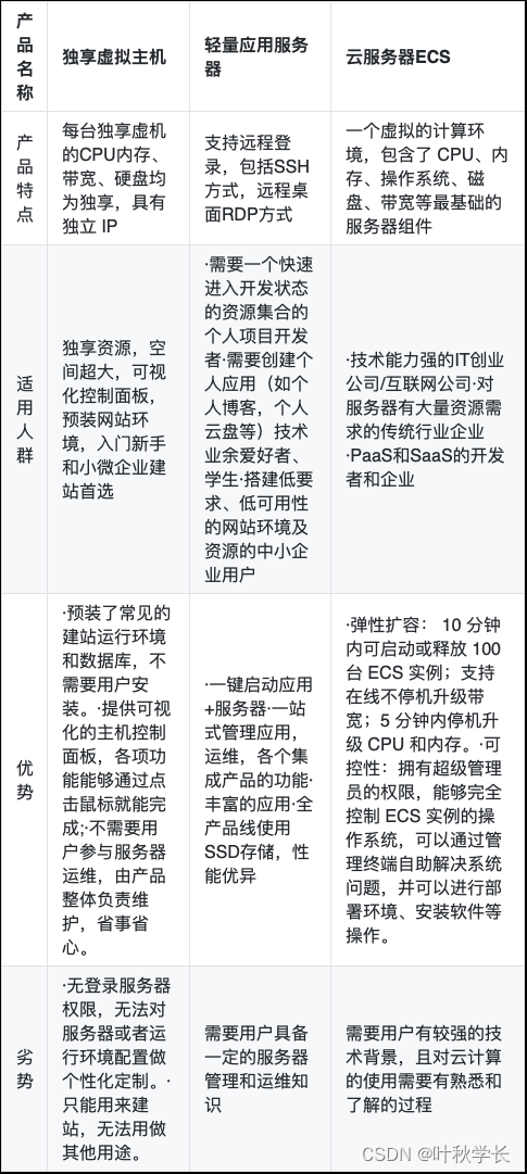 简单来说,云虚拟主机预装建站环境,不需要用户参与服务器运维,权限低,适用于入门级建站首选;云服务器ECS技术门槛要求一些,用户需要根据自身所需环境自行搭建,权限高,支持弹性扩容;轻量应用服务器介入二者之间,详细参考下方对比表(:独享云虚拟主机、共享云虚拟主机、云服务器 ECS 的区别?如下图):