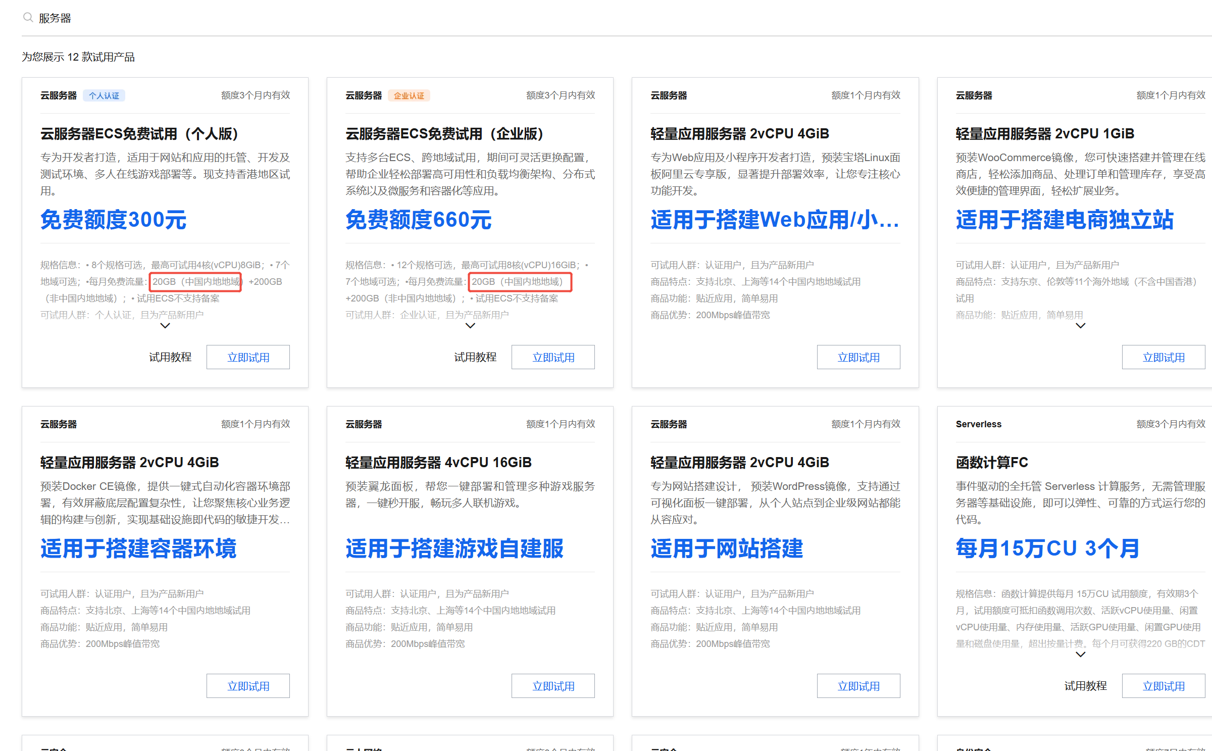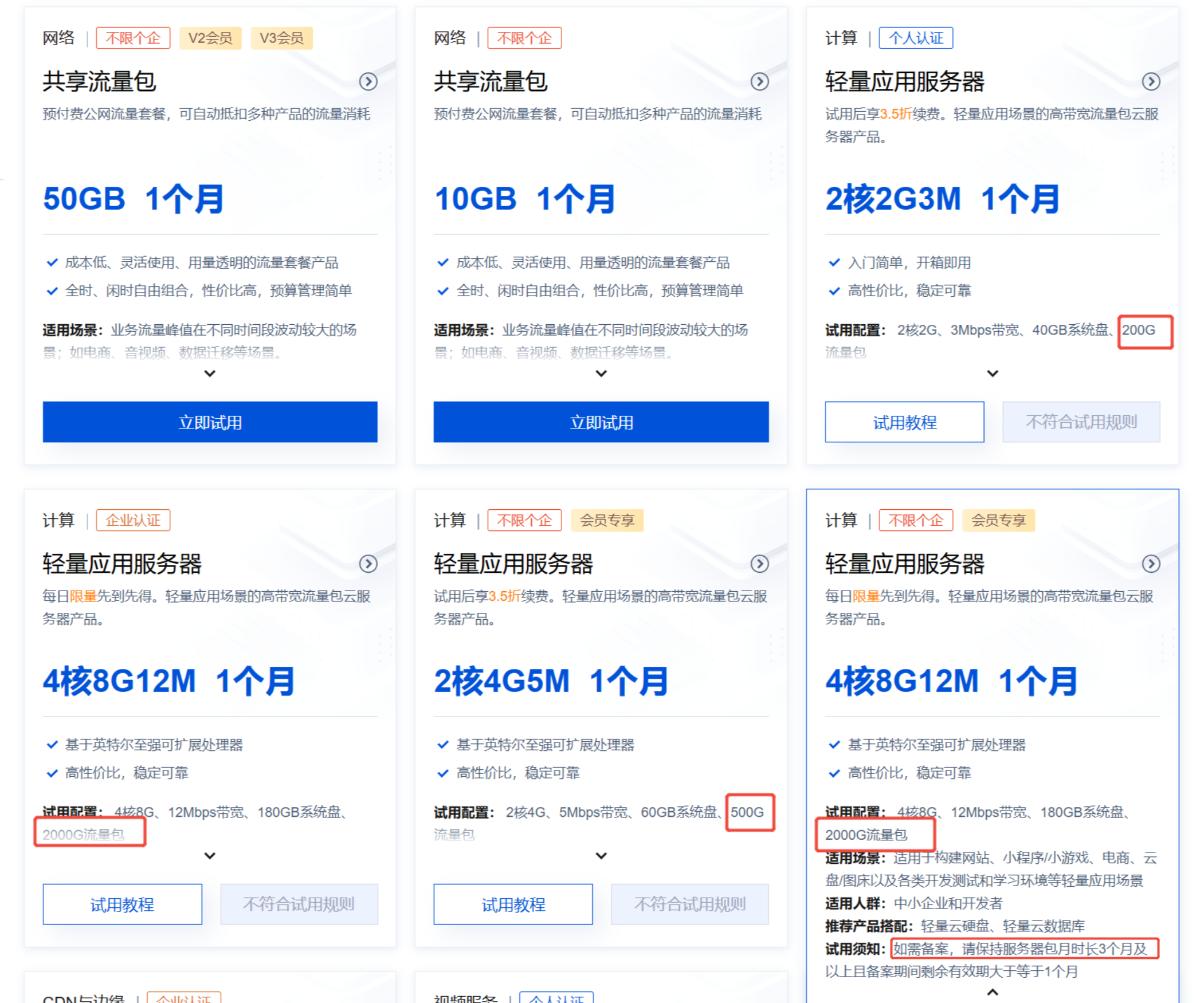 - 免费试用产品:提供配置较低,最多不超过4核,而且配置流量包较少,只能满足基础测试,而且试用产品是不支持备案的。