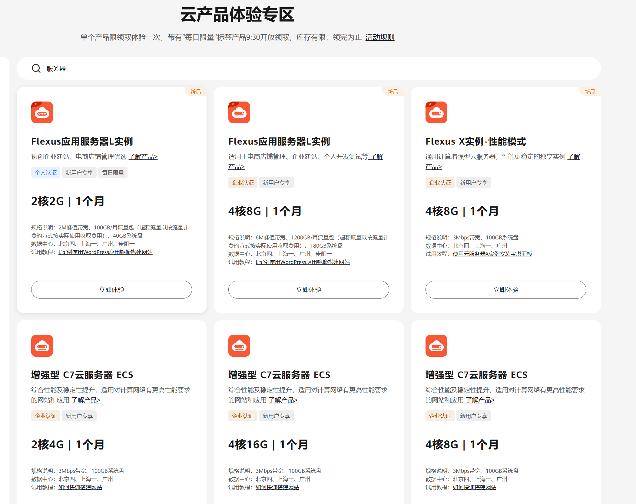 - 免费试用产品:同一个产品仅能试用一次(新用户专享),免费体验结束后续费不参与优惠,同时无法在试用机器上备案